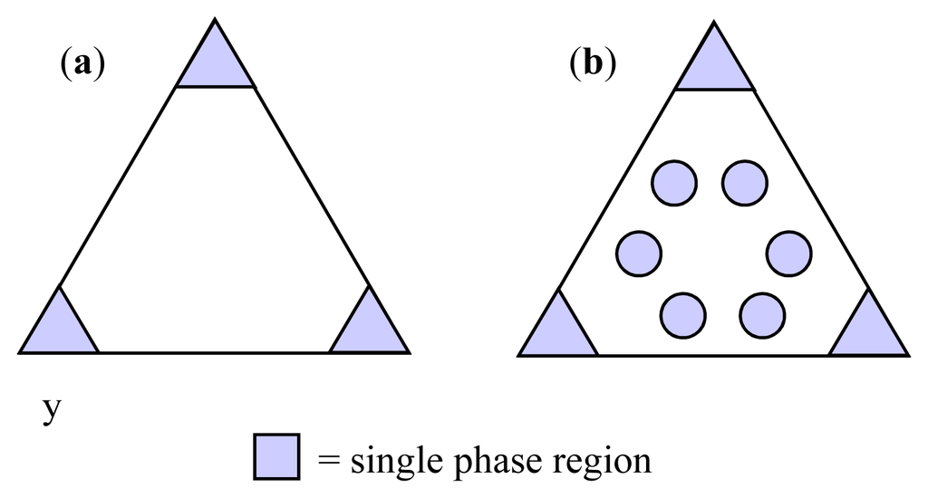 (a) Schematic ternary system in which the only single phase regions are the terminal solid solutions, with a solubility limit of y%. (b) Increased number of single phase regions (not usually seen in ternary or multicomponent systems)[2].