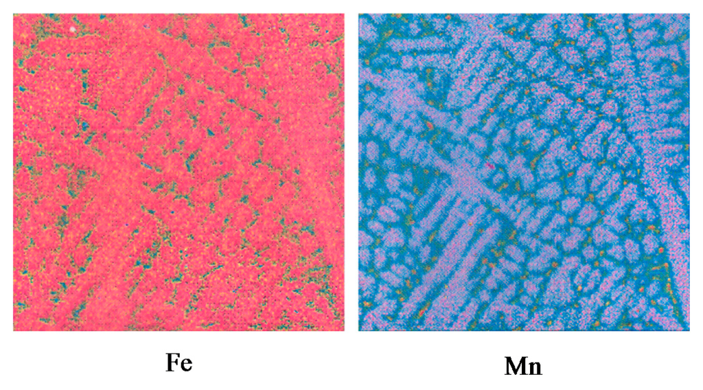 Scanning electron microscope X-ray maps [2] showing Fe and Mn distributions in an as-solidified cored dendritic structure in chill cast single phase fcc Cr20Mn20Fe20Co20Ni2.