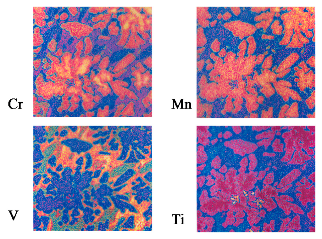 Scanning electron microscope X-ray maps showing Cr, Mn, V and Ti distributions in an as-solidified cored dendritic structure in chill cast Cr14.3Mn14.3Fe14.3Co14.3Ni14.3V14.3Ti14.3 [2].