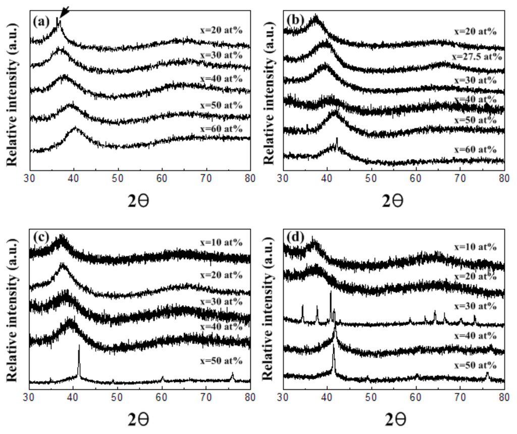 X-ray diffractograms from melt spun amorphous (Ti33Zr33Hf33)100−x−y(Ni50Cu50)xAly alloys: (a) y = 0at%; (b) y = 10at%; and (c) y = 20at%; and (d) y = 30at% [27].