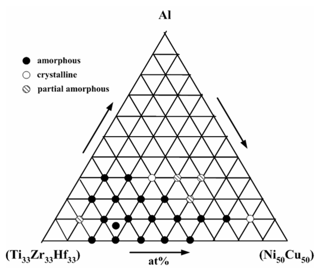 Ternary phase diagram for melt spun (Ti33Zr33Hf33)100−x−y(Ni50Cu50)xAly alloys, showing a large amorphous phase region [27].