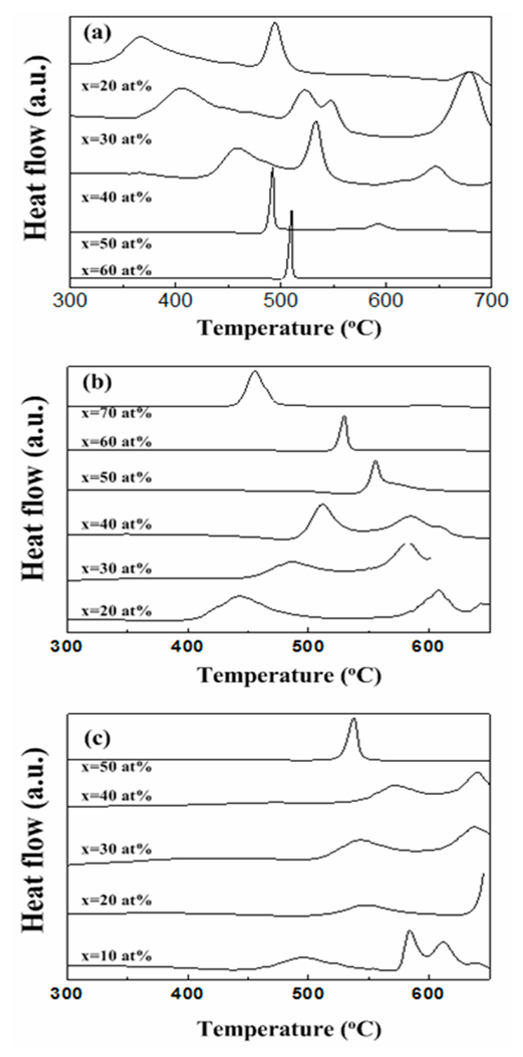 - Kim, K.-B.; Warren, P.J.; Cantor, B.; Eckert, J. Crystallization behaviour of Novel (Ti33Zr33Hf 33)100−x(Ni50Cu50)x alloys with x = 48 to 55. J. Metastable Nanocryst. Mater 2005, ISMANAM-2004, 657–660. [Google Scholar]