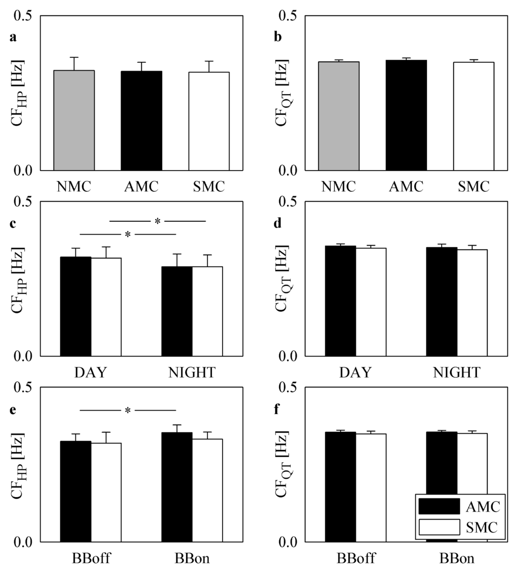 Bar and grouped bar graphs show the CF of the first IMF computed over HP and QT variability in (a,c,e) and (b,d,f), respectively. The series were derived from BBoff NMCs (gray bars), AMCs (black bars) and SMCs (white bars) during DAY in (a) and (b), from BBoff AMCs and SMCs during DAY and NIGHT in (c) and (d) and from AMCs and SMCs both BBoff and BBon during DAY in (e) and (f). Values are given as the mean plus standard deviation. The symbol * indicates p < 0.05.