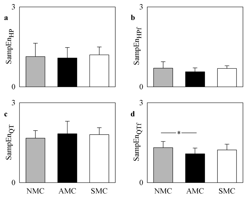 Bar graphs show the results of short-term complexity analysis over HP and QT variability in (a,b) and (c,d), respectively. The series were derived from BBoff NMCs (gray bars) and MCs during DAY. MCs were divided in AMCs (black bars) and SMCs (white bars). SampEn was assessed over the original series in (a) and (c) and over the EMD-filtered series in (b) and (d). Values are given as the mean plus standard deviation. The symbol * indicates p < 0.05.