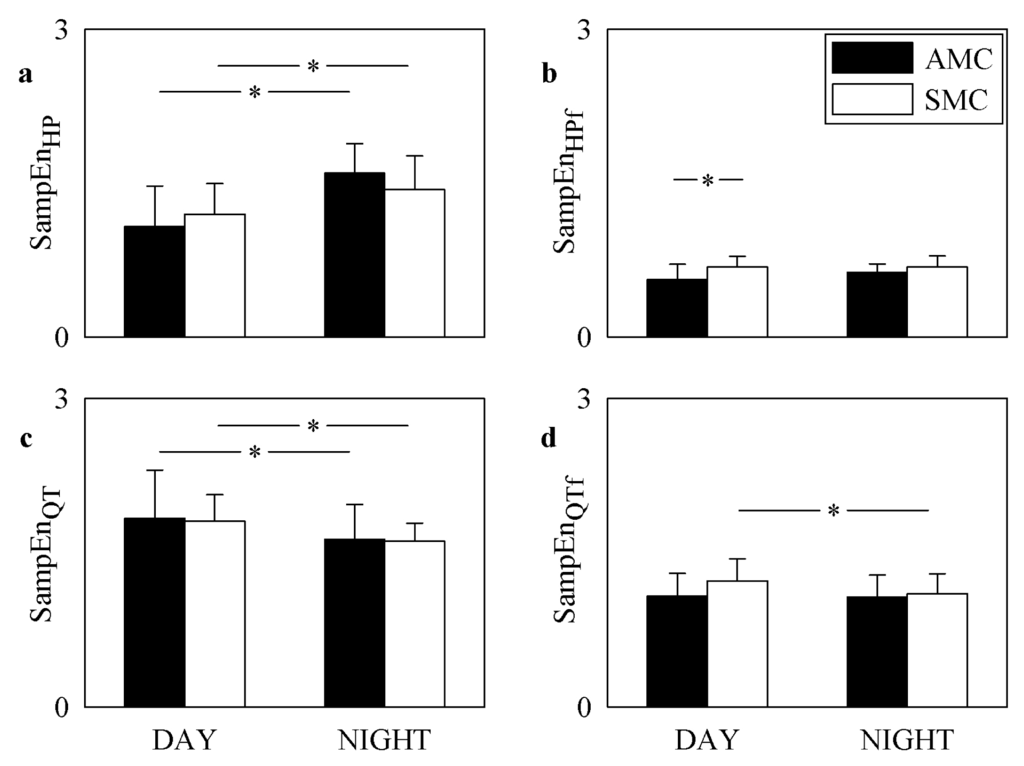 Figure 4 shows SampEn computed over the beat-to-beat variability of HP (Figure 4a,b) and QT (Figure 4c,d) in BBoff MCs during DAY and NIGHT. MCs were divided into AMCs (black bars) and SMCs (white bars). SampEn was computed over the original HP and QT series in Figure 4a,c, respectively, and over the EMD-filtered HP and QT versions in Figure 4b,d, respectively. SampEn computed over the HP variability increased during NIGHT in both AMCs and SMCs (Figure 4a), while this circadian rhythm was not evident in SampEn computed over the EMD-filtered HP variability (Figure 4b). Conversely, while SampEn computed over the HP variability was not able to distinguish AMCs from SMCs during both DAY and NIGHT (Figure 4a), SampEn computed over the EMD-filtered HP variability differentiated AMCs and SMCs during DAY, being larger in SMCs than in AMCs (Figure 4b). SampEn computed over the QT variability decreased during NIGHT in both AMCs and SMCs (Figure 4c), while this circadian rhythm was observed in SampEn calculated over the EMD-filtered QT series only in SMCs (Figure 4d).