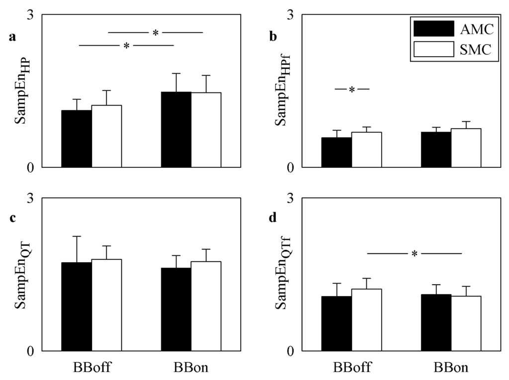 Grouped bar graphs show the results of short-term complexity analysis over HP and QT variability in (a,b) and (c,d), respectively. The series were derived from BBoff and BBon MCs during DAY. MCs were divided in AMCs (black bars) and SMCs (white bars). SampEn was assessed over the original series in (a) and (c) and over the EMD-filtered series in (b) and (d). Values are given as the mean plus standard deviation. The symbol * indicates p < 0.05.