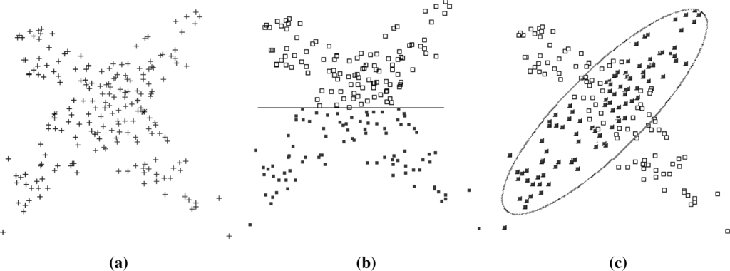 Example of a clustering problem. (a) Dataset X1; (b) solution for k = 2; and (c) another solution for k = 2.