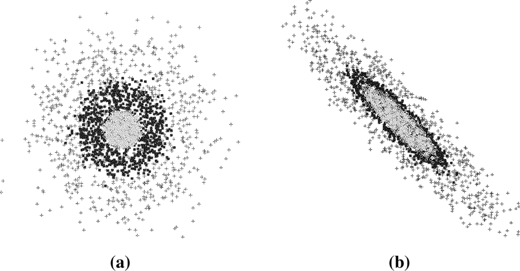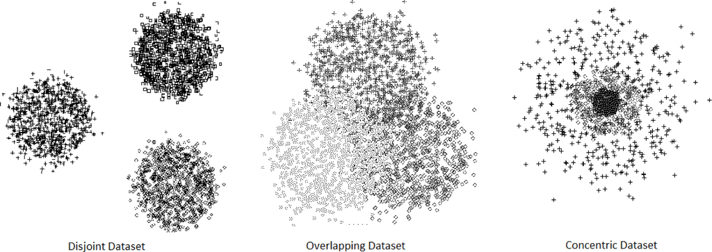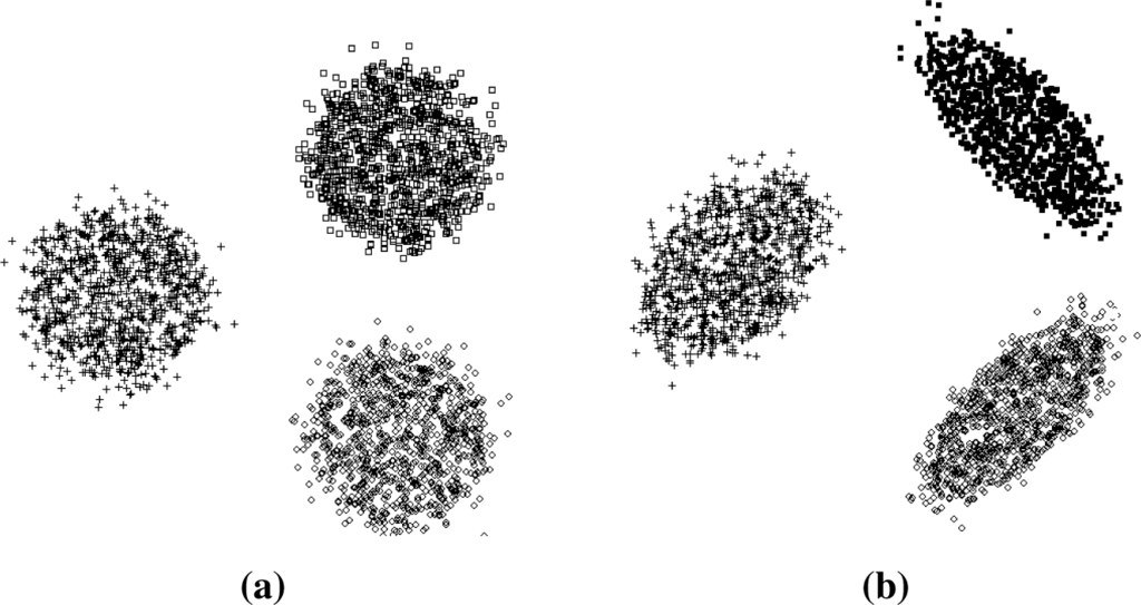 The rest of this work is organized as follows: In Section 2, we briefly discuss the concept of information content, entropy and the maximum entropy principle. Then, we approach such issues in the context of the clustering problem. In Section 3, we formalize the underlying ideas and describe the main line of our method (in what follows, clustering based on entropy (CBE)). In Section 4, we present a general description of the datasets. Such datasets were grouped into three categories: (1) synthetic Gaussian datasets; (2) synthetic non-Gaussian datasets; and (3) experimental datasets taken from the UCIdatabase repository. In Section 5, we present the methodology to evaluate the effectiveness of CBE regardless of a validity index. In Section 6, we show the experimental results. We use synthetically-generated Gaussian datasets and apply a Bayes classifier (BC) [63–65]. We use the results as a standard for comparison due to its optimal behavior. Next, we consider synthetic non-Gaussian datasets. We prove that CBE yields results comparable to those obtained by a multilayer perceptron network (MLP). We show that our (non-supervised) method’s results are comparable to those of BC and MLP, even though these are supervised. The results of other clustering methods are also presented, including an information theoretic-based method (ENCLUS). Finally, in Section 7, we present our conclusions. We have included three appendices expounding important details.