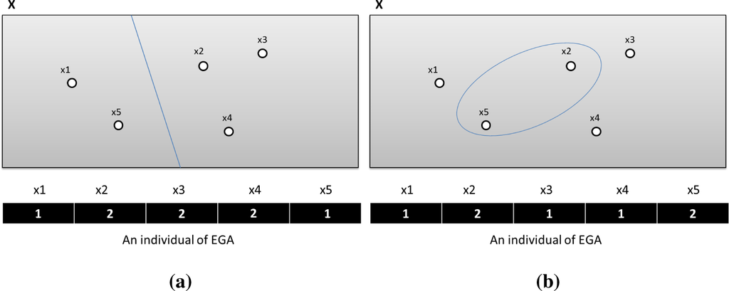 From this encoding, Π1 = {C1 = {x1, x5}, C2 = {x2, x3, x4}} and Π2 = {C1 = {x1, x3, x4}, C2 = {x2, x5}}. EGA generates a population of feasible partition sets and evaluates them in accordance with their dominance. Evolution of the population takes place after the repeated application of the genetic operators, as described in [48,49].