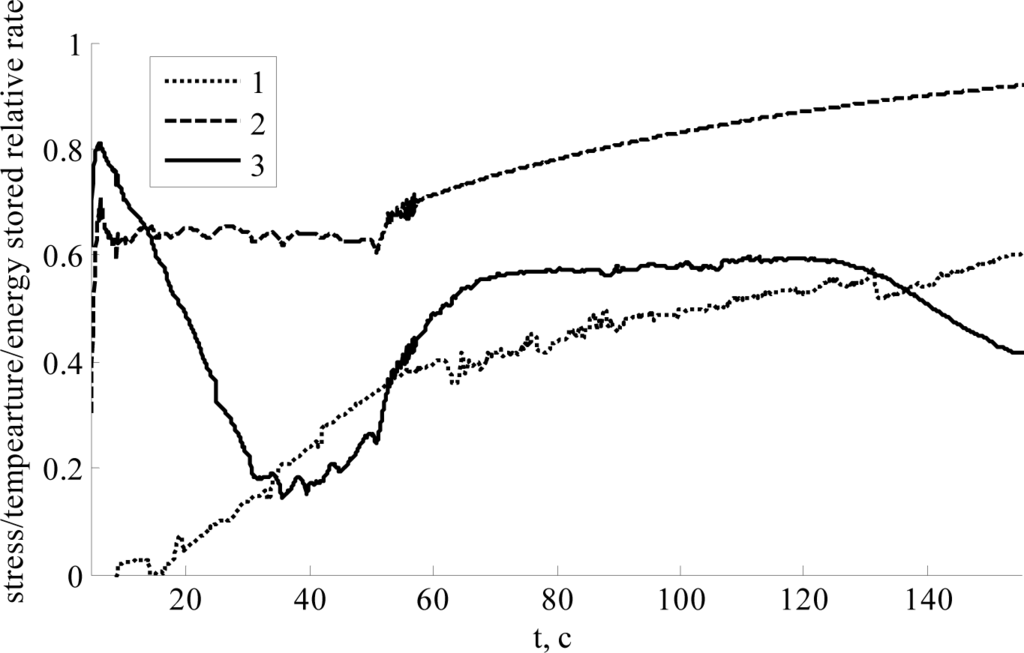 Temperature evolution (1), stress-strain curve (2), stored energy rate (3) for Armco iron specimen. Stress and temperature are normalized to their maximum values and the stored energy rate is normalized to current power applied to the specimen.