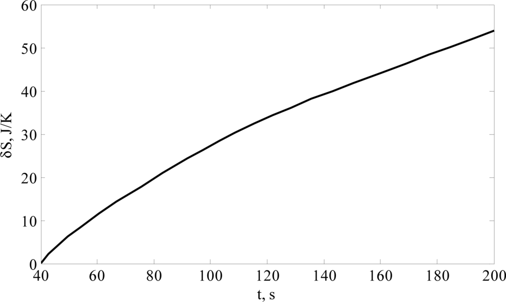The entropy production curve (Figure 2) and the entropy curve (Figure 3) reflect the transition from plateaus to decreasing branch on the energy storage rate curve (Figure 1). The entropy production reaches a constant value when the energy storage rate decreases (the leading processes are dissipative). The linear segment on the entropy curve occurs in this case.