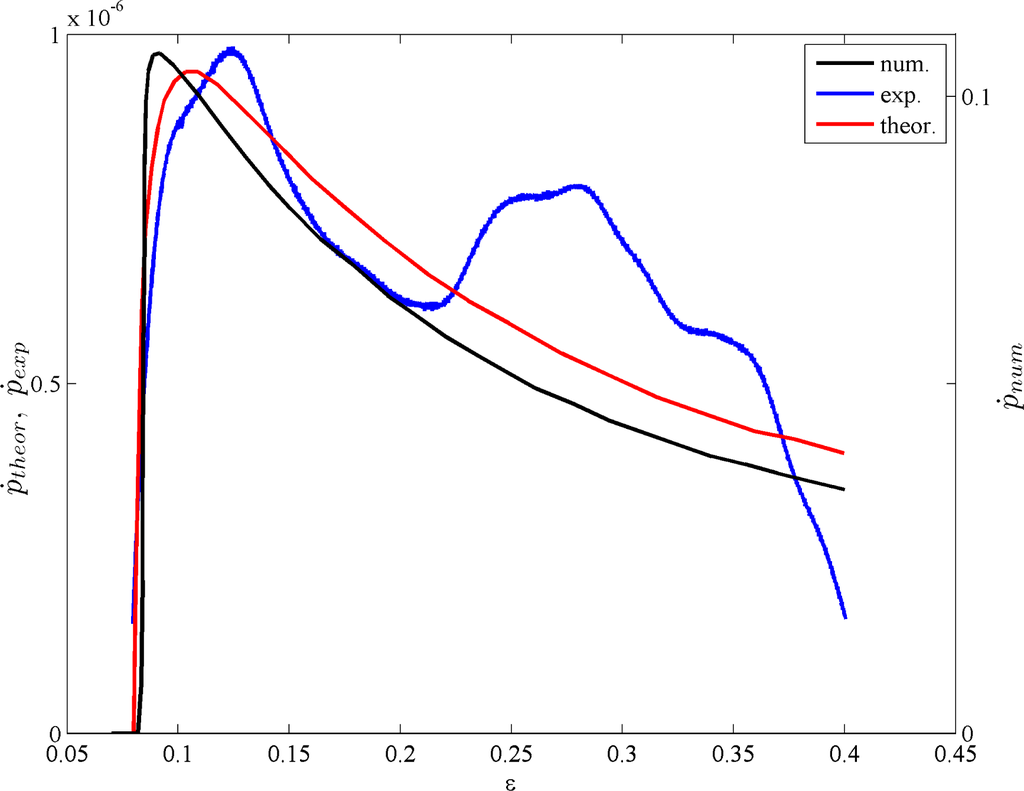 obtained from the theoretical analysis is presented in Figure 4 (red line). Results of the substitution of the real experimental data to (27) give similar trend and value for the structural strain rate (blue line). The