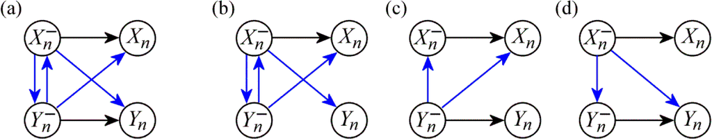 (a) Causal structure of a bivariate dynamic process {X,Y}, evidencing internal dynamics of a single process (black arrows) and causal interactions from one process to the other (blue arrows). (b) Absence of internal dynamics in the process Y. (c) Absence of causal interactions from X to Y. (d) Absence of causal interactions from Y to X.