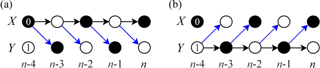 (a) Time series graph depicting the dynamics of a binary bivariate process {X,Y} assuming values 0 and 1 and generated by the deterministic relations Xn = 1–Xn-1, Yn = Xn-1, setting internal dynamics in X and causal interactions from X to Y. (b) The bivariate process is now generated by the relations Yn = 1–Yn-1, Xn = Yn-1, setting internal dynamics in Y and causal interactions from Y to X. Since the process outcomes are identical in the two cases, the measures of information dynamics relevant to the process Y are the same: PY = SY = CX→Y = H(Yn) = log2, TX→Y = SY|X = 0. Therefore, considering Y as target process we have causal interactions without information transfer in (a) and internal dynamics without internal information in (b).