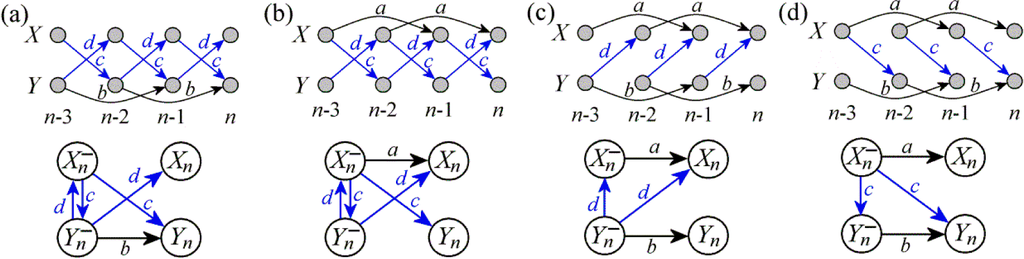 Graphical representation of the bivariate AR process {X,Y} of Equation (17), imposing: (a) absence of internal dynamics in X (a = 0); (b) absence of internal dynamics in Y (b = 0); (c) absence of causal interactions from X to Y (c = 0); (d) absence of causal interactions from Y to X (d = 0). The causal structure of the process is represented with a detailed time series graph (up) and with a condensed graph showing only the interactions between the past and present of the two processes (down), indicating for each arrow the parameter that has effect on the causal interaction depicted by the arrow.