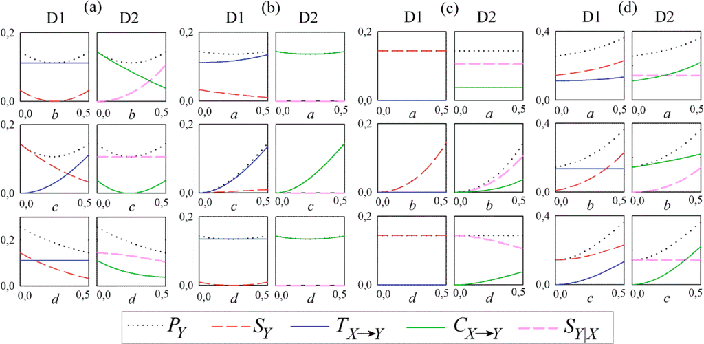 Information dynamics computed as a function of the parameters of the bivariate AR process {X,Y} of Equation (17), imposing: (a) absence of internal dynamics in X (a = 0); (b) absence of internal dynamics in Y (b = 0); (c) absence causal interactions from X to Y (c = 0); (d) absence causal interactions from Y to X (d = 0). In each condition, one of the three nonzero parameters is varied in the range 0–0.5 while keeping the other two parameters equal to 0.5. In the plots, the predictive information is decomposed either as the sum of information storage and information transfer (D1: PY = SY+TX→Y) or as the sum of cross information and internal information (D2: PY = CX→Y + SY|X).