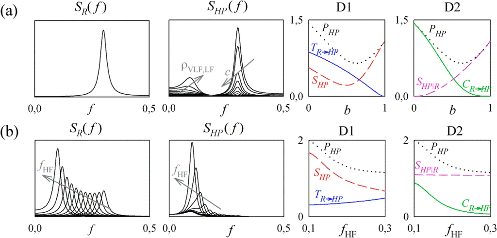 Information dynamics computed for different parameter settings of the bivariate AR process {R,HP} of Equation (18), simulating: (a) a shift in the sympatho-vagal balance, obtained changing the parameter b from 0 to 1 and setting ρVLF = 0.2b, ρLF = 0.8b; c = 1–b; (b) a shift in the respiratory frequency, obtained changing the parameter fHF from 0.1 to 0.3. Left plots depict the profiles of the power spectral density of the simulated RV, SR(f ), and HPV, SHP( f ). Right plots depict the expansion of the predictive information as the sum of information storage and information transfer (D1: PHP = SHP+TR→HP) or as the sum of cross information and internal information (D2: PHP = CR→HP+SHP|R).