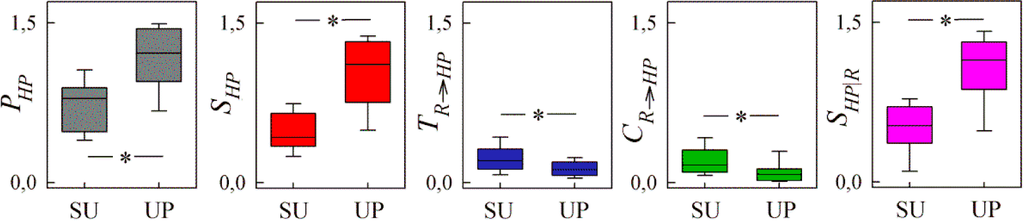 Information dynamics computed for HPV and RV series measured during the HUT protocol. Box plots depict the distributions over subjects of the predictive information of HPV (PHP), the information storage of HPV (SHP), the information transfer from RV to HPV (TR→HP), the cross information from RV to HPV (CR→HP), and the internal information of HPV (SHP|R), computed in the supine (SU) and upright (UP) conditions. * p<0.01 SU vs. UP.