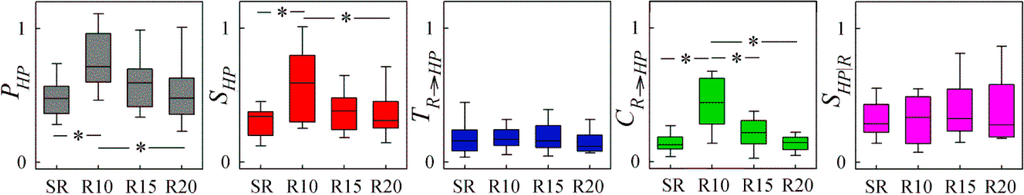 Information dynamics computed for HPV and RV series measured during the PB protocol. Box plots depict the distributions over subjects of the predictive information of HPV (PHP), the information storage of HPV (SHP), the information transfer from RV to HPV (TR→HP), the cross information from RV to HPV (CR→HP), and the internal information of HPV (SHP|R), computed during spontaneous respiration (SR) and paced respiration at 10, 15 and 20 breaths/min. * p<0.01, ANOVA and post-hoc pairwise test.