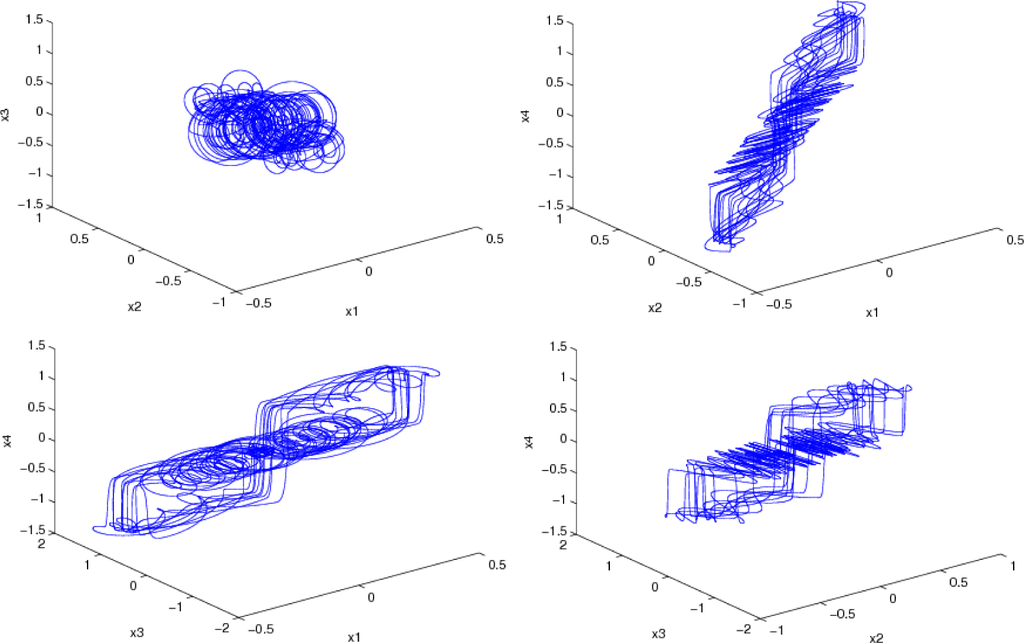The initial value is set as (0.1,0.1,−0.1,0.1)T. When α = 0.97, the Lyapunov exponent of system (1) can be calculated as LE1 = 0.2187, LE2 = 0.0828, LE3 = 0, LE1 = −85.2329. The two positive Lyapunov exponents show that system (1) is hyperchaotic, and the hyperchaotic attractors are shown in Figure 1.