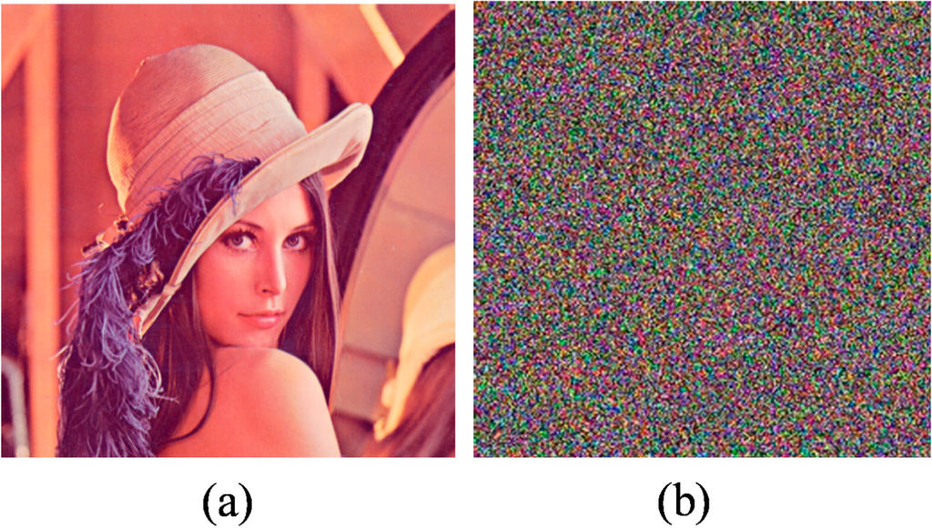 In this section, we provide some experimental results to illustrate the performance of the proposed encryption algorithm. We select secret keys with the initial values tf = 300, α = 0.97, h = 0.005, x0 = [0.1,0.1,−0.1,0.1]T. According to the proposed algorithm, we encrypt the Lena image, and the plain image and the corresponding cipher image are depicted in Figure 2a,b.