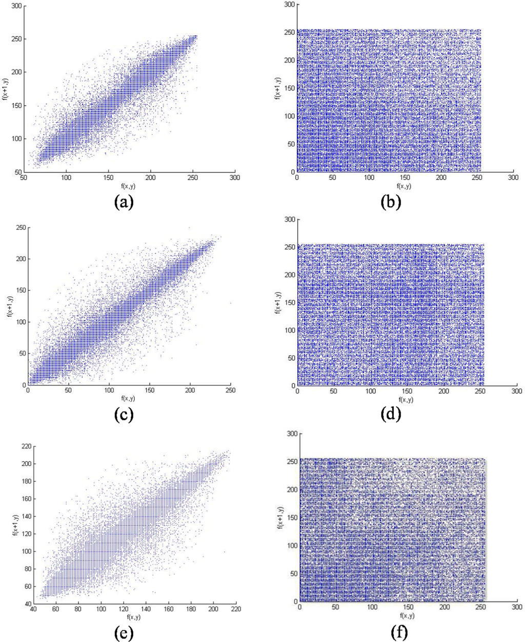 Horizontal and vertical correlation of the plain image and the cipher image. (a) horizontal correlation of the plain image (R); (b) horizontal correlation of the cipher image (R); (c) horizontal correlation of the plain image (G); (d) horizontal correlation of the cipher image (G); (e) horizontal correlation of the plain image (B); (f) horizontal correlation of the cipher image (B).