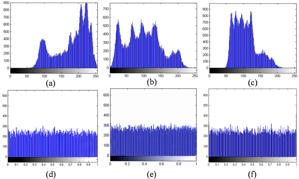 Histogram of the plain image and the encrypted image. (a)‒(c) Histograms of the plain R, G and B images, respectively; (d)‒(f) Histograms of the cipher R, G and B images, respectively.