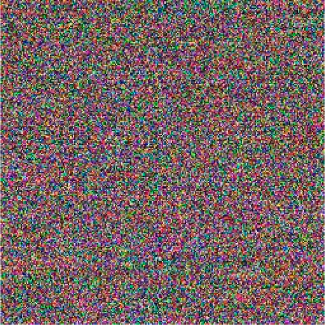 Step 6: Replace the three vectors HR, HG, HB with length MN into three M × N matrices HR′, HG′, HB′, M = cat (3,HR′,HG′,HB′) and combine the three two-dimensional images into a three-dimensional image. Thus, M is the encrypted image. The decryption process is just the reverse of the encryption process, therefore, we do not describe it.