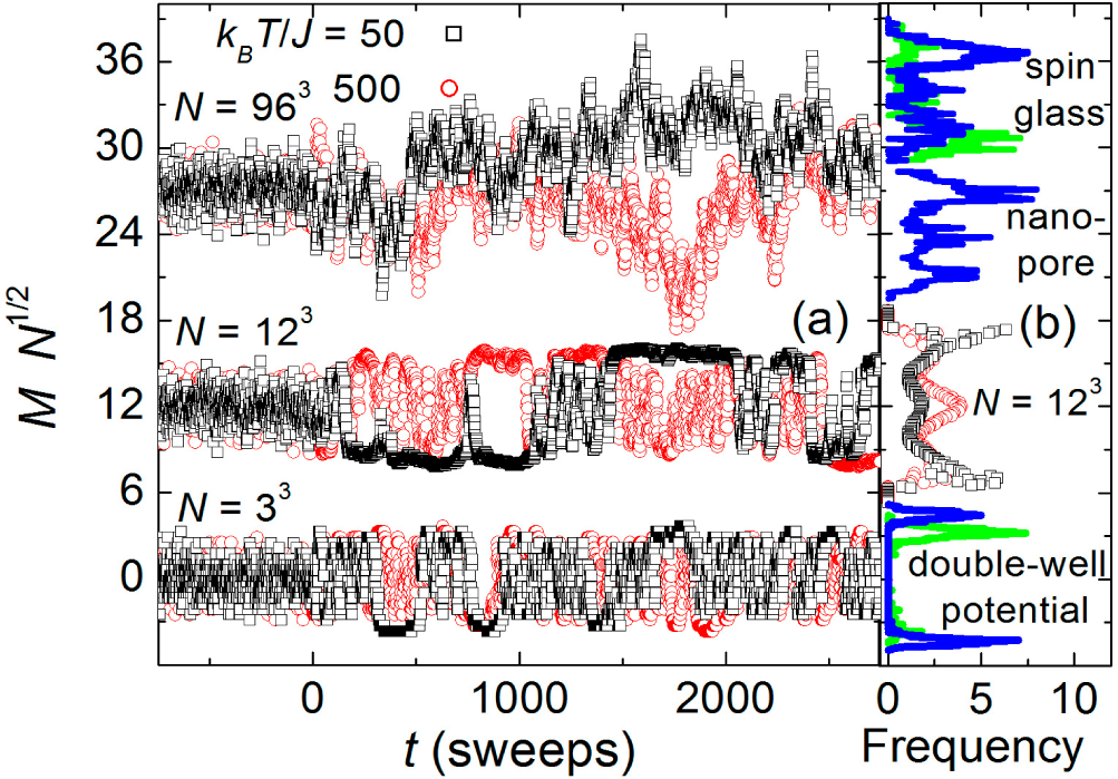 (a) Scaled magnetization versus time at two temperatures, from simulations of the Ising model [18]. Simulations from lattices with different sizes, N, are offset for clarity. The dynamics changes abruptly at t = 0 when a nonlinear correction (Equation (2)) is included with Boltzmann’s factor (Equation (1)). (b) Histograms of the simulations from N =123 (symbols) and from the noise measured in three types of samples (solid lines). Note that the simulations show trimodal behavior, similar to the spin glass [28] and nanopore systems [29], but different from the bimodal behavior of a sculpted double-well potential [30].