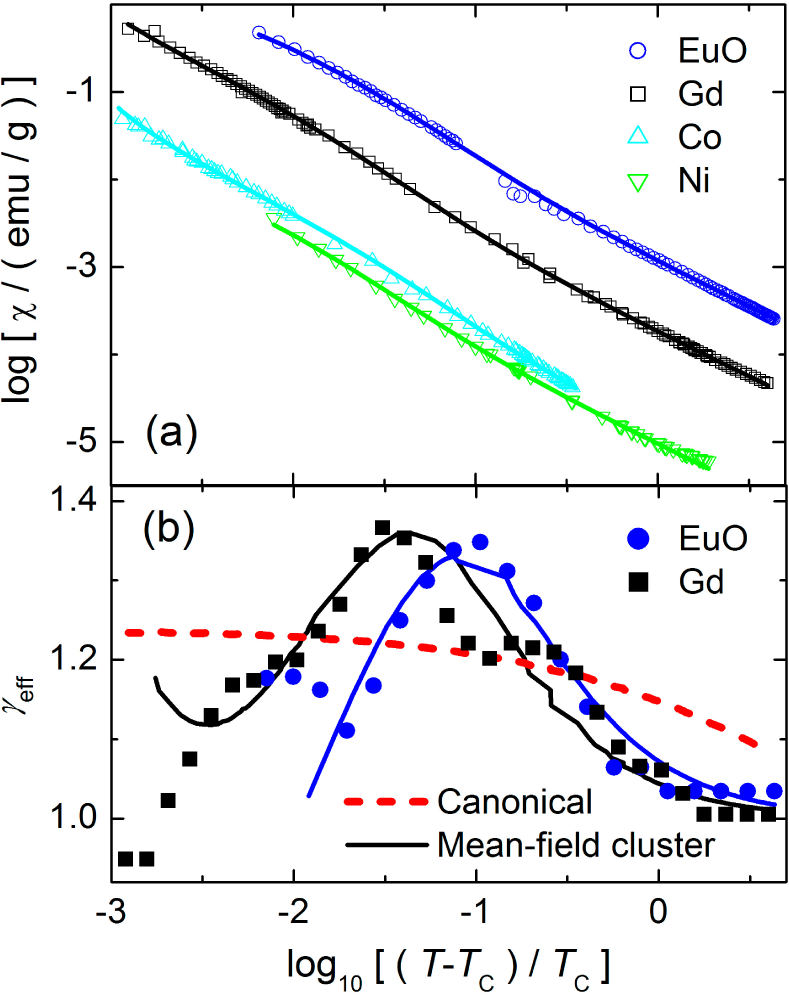 Figure 10 shows paramagnetic susceptibility (χ) as a function of reduced temperature above the ferromagnetic transition, T > TC. The symbols are from measurements on four standard ferromagnetic materials, as given in the legend. The classical mean-field theory (Curie-Weiss law) for homogeneous systems predicts a constant critical-scaling exponent of γ = 1 in χ ∝1/(T −TC)γ whereas the data show a steeper slope, especially around (T – TC)/TC ≈ 0.01. Nearer TC, microscopic models that assume homogeneous correlations via the canonical ensemble predict a constant slope with scaling exponents of γ > 1, whereas close inspection of the data shows temperature-dependent curvature. The solid curves are from the mean-field cluster model, with μ/kBT as the constant parameter governing the temperature- dependent shape of the susceptibility. Even in the raw data it is possible to see that the mean-field cluster model for a heterogeneous distribution of independently relaxing regions gives better agreement than homogeneous models. Figure 10b shows the effective scaling exponent γeff as a function of reduced temperature for two sets of data from Figure 10a. Again these data are clearly incompatible with the Ising model in the canonical ensemble (dashed line). Indeed, more-recent measurements on ultra-pure Gd crystals show that as T → TC the critical scaling exponent returns to the classical value γeff = 1 [39], consistent with mean-field theory in the nanocanonical ensemble (solid lines). Thus, the nanocanonical ensemble significantly improves agreement between mean-field models and measured response, similar to how the nonlinear correction from nanothermodynamics improves agreement with computer simulations of the microscopic version of the same model, as shown in Figures 5 and 6.