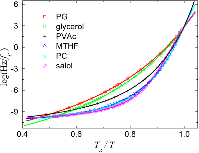 Angell plot of inverse peak frequency versus inverse temperature [12]. The Arrhenius law yields straight lines on this plot. The symbols are from measurements on six different supercooled liquids [56], as given in the legend. The solid curves are from the mean-field cluster model, with constant μ/kBT as the key parameter that governs the shape of the curves.