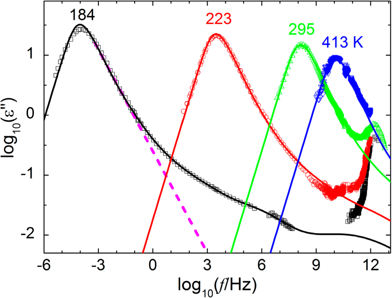 Log-log plot of dielectric loss as a function of frequency [12]. The symbols are from measurements on glycerol at four temperatures [57]. Solid lines are from the mean-field cluster model, with the heat capacity of an average-sized region CV as the adjustable parameter that governs the width and shape of the spectra. The dashed line shows a constant slope of magnitude β = 0.57, characteristic of the KWW law for stretched-exponential relaxation.