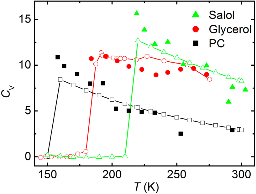Specific heat as a function of temperature [12]. Solid symbols come from CV deduced from fits to dielectric loss spectra of glycerol (from Figure 13), salol, and propylene carbonate. Open symbols (connected by solid lines to guide the eye) come from direct measurements of excess specific heat [58,59].