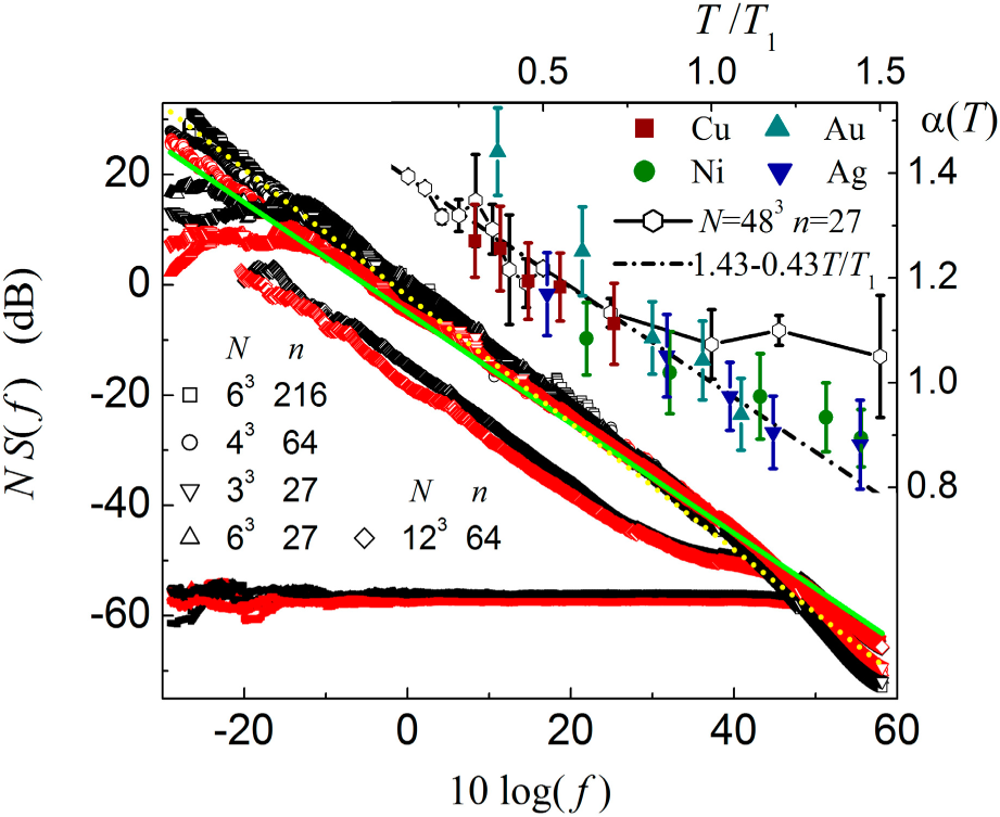 Left side shows frequency dependence of noise from simulations [18] at kBT/J = 50 and 500, similar to those in Figure 1. S(f) is multiplied by N to scale different lattice sizes (given in the legend) and log(f) is multiplied by 10 to match the dB scale. The spectra exhibiting white noise (bottom) come from using Equation (1) alone. Spectra exhibiting 1/f-like behavior (diagonal) come from the same model using both Equation (1) and Equation (2). Over a broad range of frequencies these simulations can be characterized by S(f) ∝ 1/fα(T), with α(T) ≈ 1.0 for kBT/J = 500 (solid line) and α(T) ≈ 1.15 for kBT/J = 50 (dotted line). Diamond-shaped symbols, which show 1/f noise at low frequencies and white noise at higher frequencies, come from a heterogeneous system. Right side of figure shows α(T) from measurements on various metallic thin-films [31] (solid symbols) and simulations (open hexagons connected by solid lines). Note that the temperatures are normalized by T1, where α(T) extrapolates to 1.