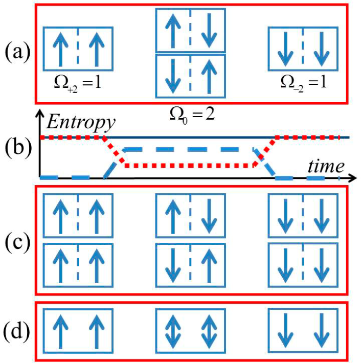 Sketch of possible states in a region containing two binary spins [18]. (a) For distinguishable spins there is one way to have both up (Ω+2 = 1) or down (Ω–2 = 1), but two ways to have zero net alignment (Ω0 = 2). (b) During thermal fluctuations the Boltzmann entropy of the spins goes up and down (dashed line). To maintain maximum entropy the entropy of a bath must go down and up (dotted line), so that the combined entropy of the system plus bath is constant (solid line). (c) When the bath has high entropy each low-entropy state in the region persists twice as long as expected from the Boltzmann factor alone. (d) Alternatively, zero alignment may come from a single state that contains a superposition of spins, consistent with de-localized particles that are indistinguishable in the region.