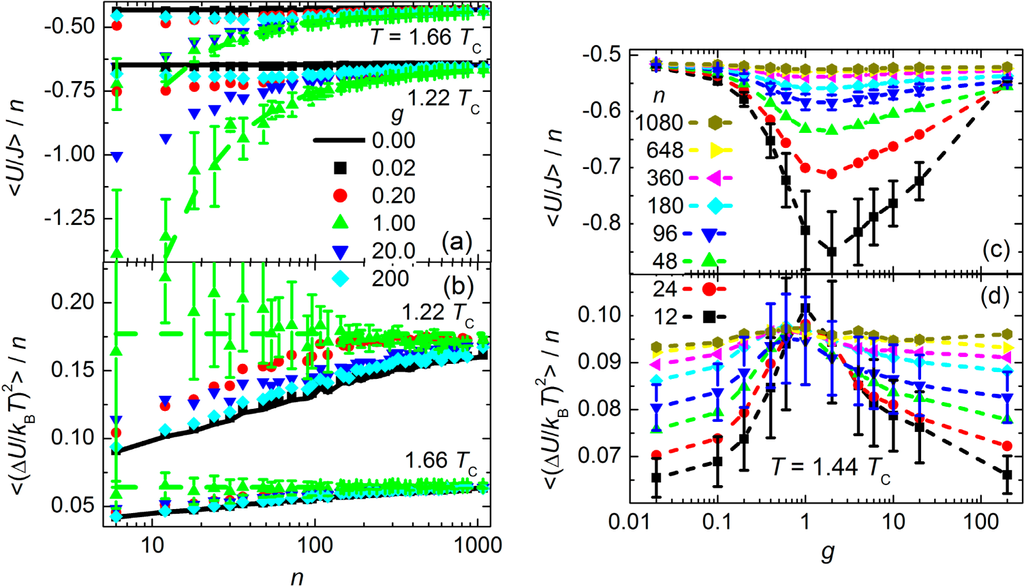 Energy fluctuations in most Monte Carlo simulations exhibit a size dependence [35] that differs from the expectation for independent small systems that entropy is extensive and additive. Figure 4 shows the average potential energy density (<U/J>/n) and its fluctuations (<(ΔU/kT)2>/n) as a function of the number of particles (n) in local regions of a large lattice. Again the simulations utilize the standard Ising model for binary spins on a simple-cubic lattice with ferromagnetic interaction between nearest-neighbors. The solid (black) lines, from simulations using Boltzmann’s factor alone (Equation (1)), show constant energy density, whereas the fluctuations in energy density increase with increasing region size. The size dependence of these energy fluctuations yields a size-dependent specific heat, and non-extensive entropy that is incompatible with the laws of nanothermodynamics for an ensemble of independently relaxing regions. The symbols in Figure 4 show the energy density and its fluctuations for the same Ising model with various strengths (g) in an approximation of Equation (2) that yields a quadratic correction to Boltzmann’s factor, with a bypass.