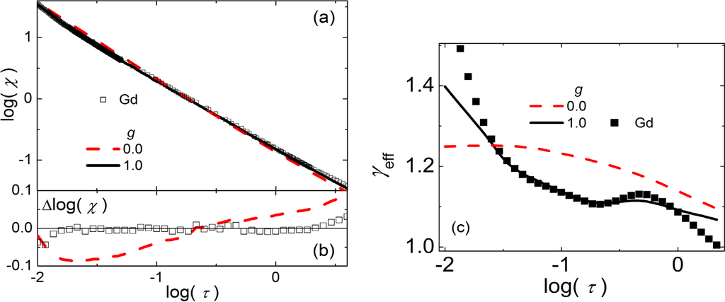 (a) Critical scaling plot of magnetic susceptibility versus reduced temperature, τ = (T−TC)/TC [16]. Symbols are from measurements of gadolinium [39–42]. Lines are from simulations of the Ising model with (g = 1, solid) and without (g = 0, dashed) the nonlinear correction. (b) Residual plot of the data (symbols) and g = 0 simulations (dashed line), with g = 1 defining the origin (Δlog(χ) = 0). (c) Effective scaling exponent (magnitude of slope from Figure 5a) for the Gd data and Ising-model simulations.