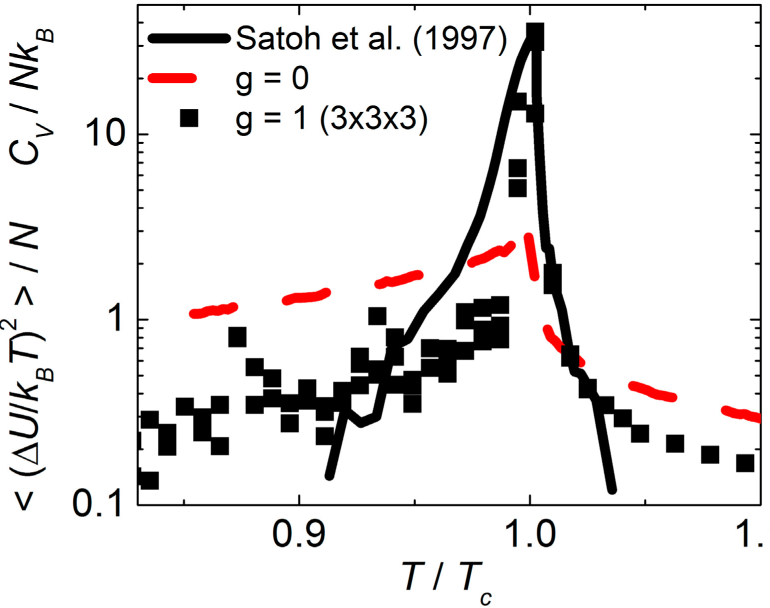 The solid line in Figure 6 shows the excess specific heat measured in the colossal magneto-resistance material LaMnO3. The peak identifies the phase transition from a Jahn-Teller distortion that occurs at about 730 K. The dashed line comes from simulations of the Ising model using Boltzmann’s factor alone (g = 0), while the solid symbols come from the same model with the nonlinear correction (g = 1) and the optimal region size of n = 27. Again the nonlinear correction gives significantly better agreement with the measured behavior.