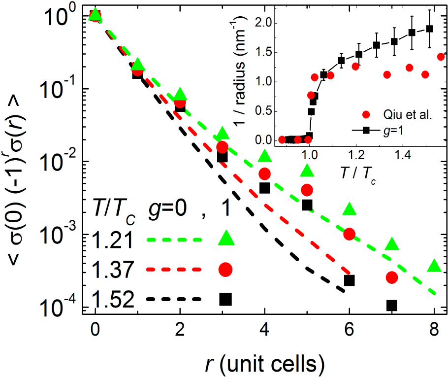 Figure 8 shows the pair-correlation function from simulations of the Ising model without (g = 0, dashed lines) and with (g = 1, symbols) the nonlinear correction. When g = 0 there is a smooth loss in correlation, characteristic of the classical picture. When g = 1 there is stronger correlation over the three contiguous lattice sites within each region, then an abrupt loss in correlation to the neighboring region, consistent with the measured pair distribution function shown in the lower part of Figure 7. The inset of Figure 8 shows that linear regression on three adjacent sites in a region, from simulations with g = 1, yields a correlation length that is similar to the radius of distinct regions determined by neutron scattering.
