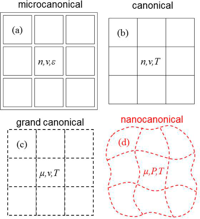 Various ensembles for fluctuations inside a bulk sample [13]. The microcanonical ensemble (a) applies to fully-closed fluctuations that conserve number of particles (n), volume (v), and energy (ε). The canonical ensemble (b) (n,v,T) applies to fluctuations at constant volume when heat flows in and out from the rest of the sample. The grand canonical ensemble (c) (μ,v,T) applies to fluctuations at constant volume when particles also flow in and out from the rest of the sample. The “nanocanonical” ensemble (d) (μ,P,T) applies to fully-open fluctuations, where the volume of each fluctuation is allowed to change as particles flow in and out.