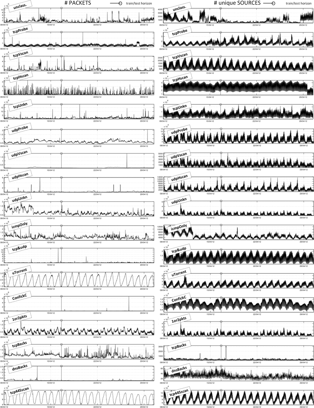 • Total amount of packets (#pkts) and total amount of sources (#srcs), considering the whole darkspace and collected every 10 min. These two signals are easy to obtain and do not require any in-depth analysis.