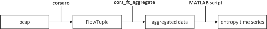 Entropy time series are obtained following the process scheme outlined in Figure 3. A MATLAB script is used to calculate entropy measures. Previously, data are pre-processed by corsaro: transformed from pcap to FlowTuple vectors and later aggregated to measure the occurrences every 10 min (the data aggregation is carried out with the cors_ft_aggregate tool, also from the corsaro suite). The FlowTuple format is displayed in Listing 2. Figure 4 displays the entropy time series for the analyzed traffic from April 8, 2012, 12:00 UTC, to May 1, 2012, 00:00 UTC.