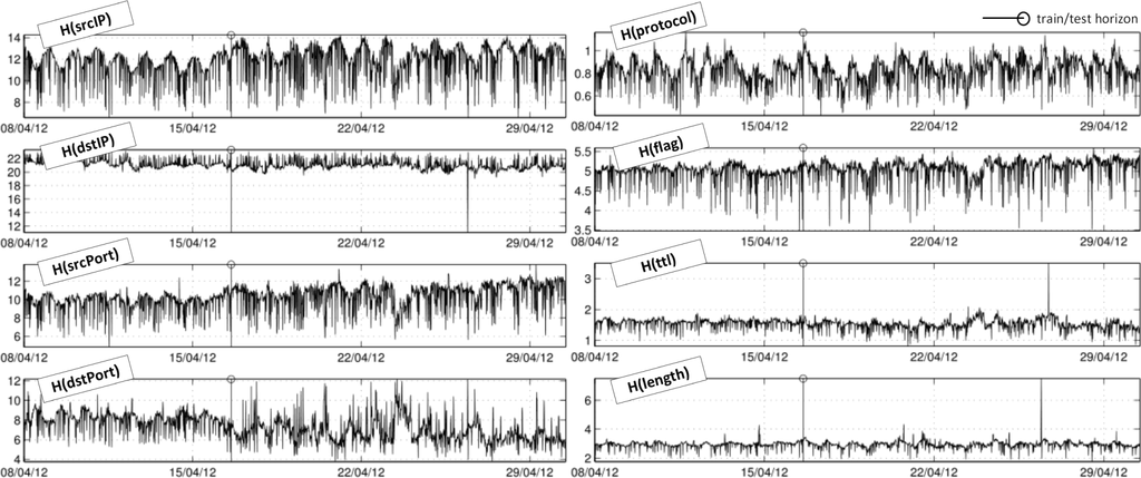 • Entropy time series, i.e., signals corresponding to distribution measures of flow-traffic features. We introduced them in Section 4, and they are displayed in Figure 4.
