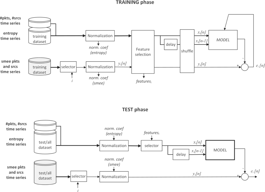 • A delay step was applied to the inputs, doubling the number of predictors. Hence, models were also optionally provided with memory capabilities (entropy derivatives) to fit traffic types, i.e., the model additionally deployed x[n − 1] and not only x[n] as part of the input vector.