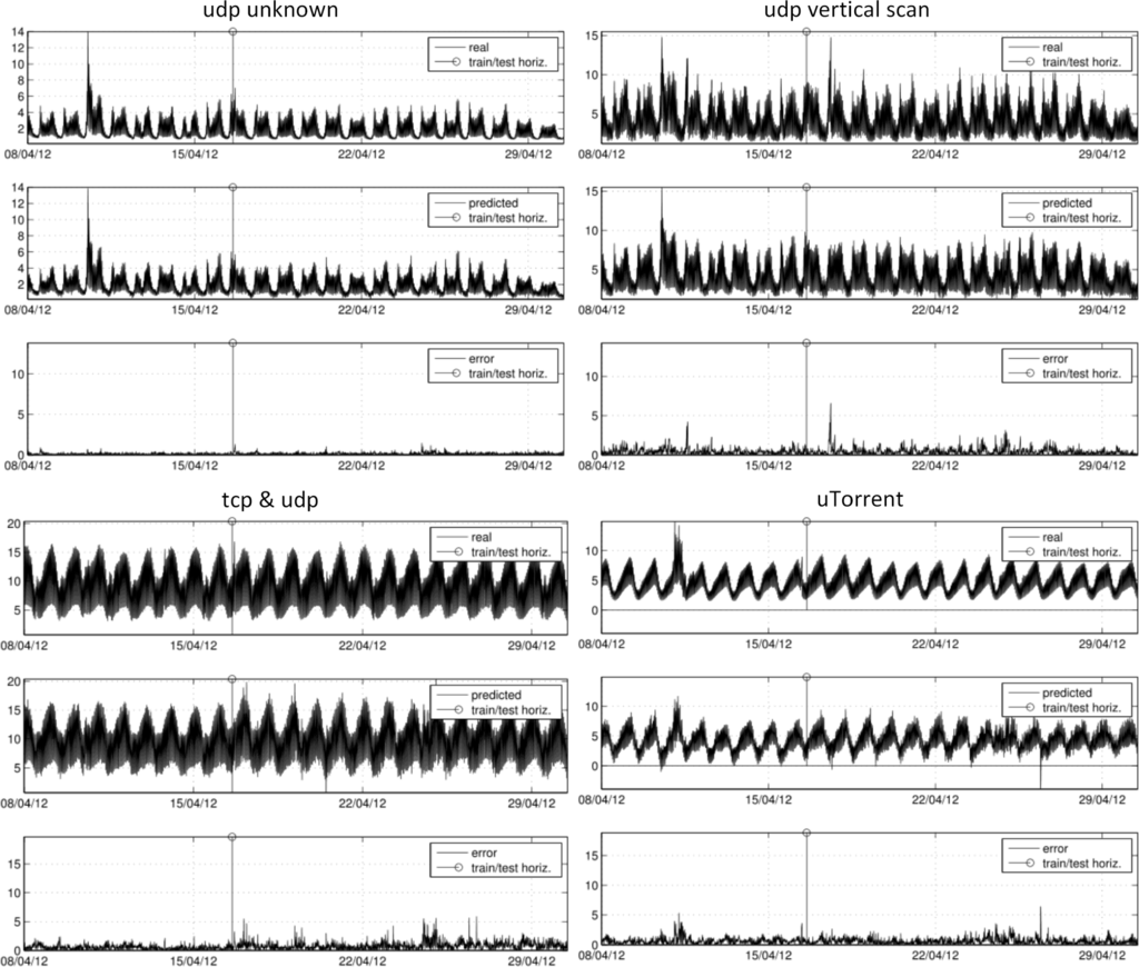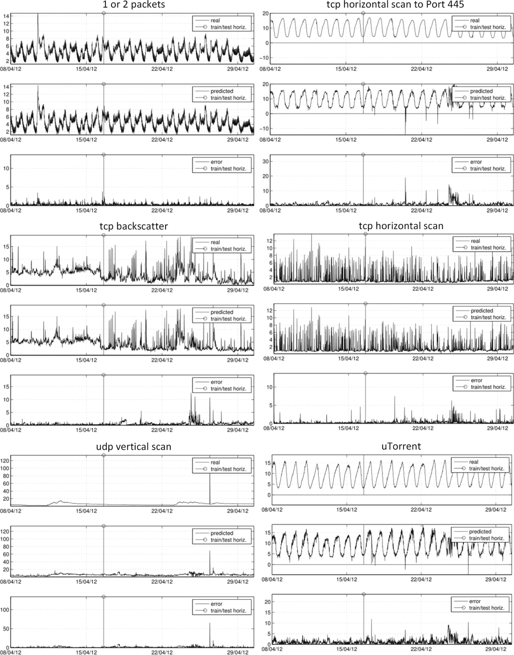 Figure 8. Real, predicted and error graphs for predictable smee types (sources). The y-axes show s-normalized unique sources per hour.