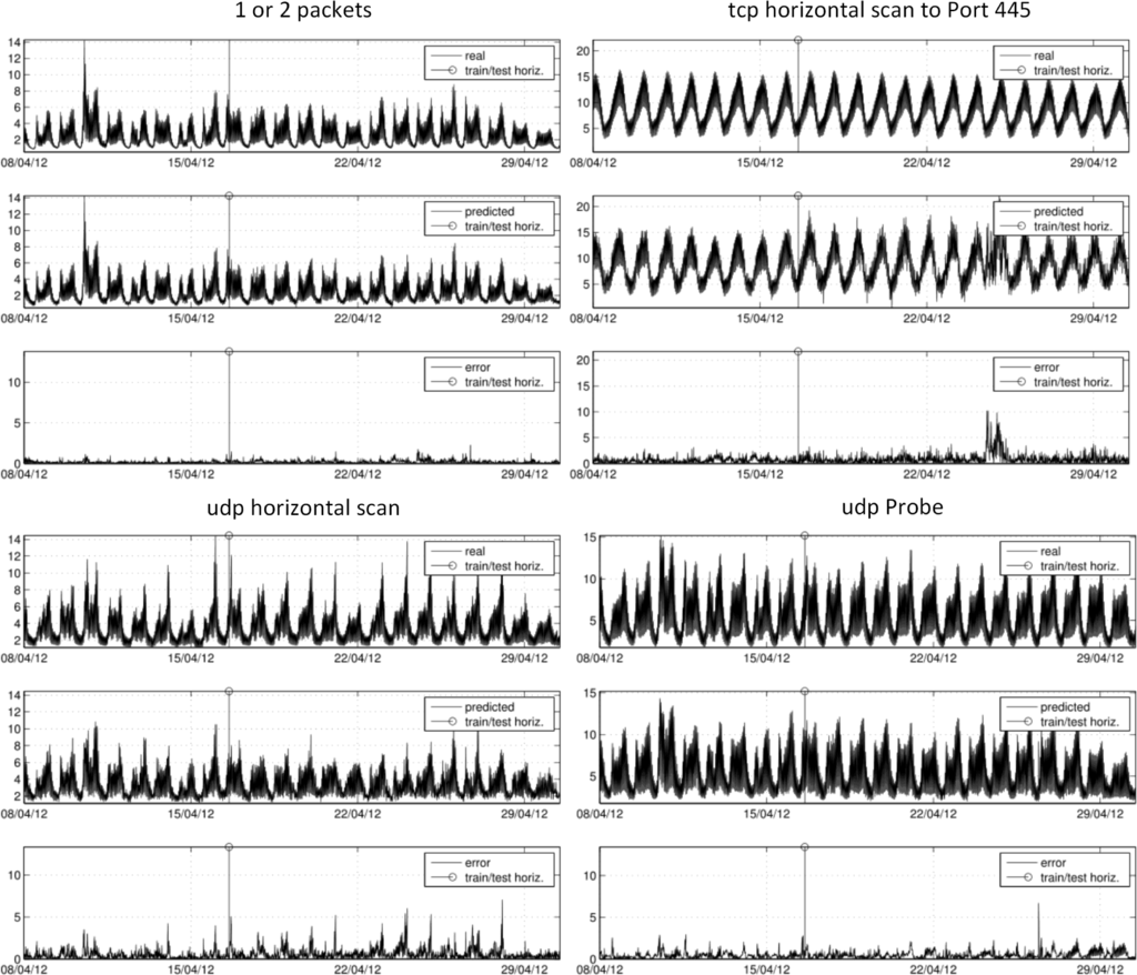• Unstable period of predictions: There is a disruption in some of the predicted signals from Samples 2370 to 2520 (approximately, from Tuesday, April 24, 2012, 23:00:00, to Thursday April 26, 2012, 00:00:00; 25 h). There is nothing significant, neither in entropy signals nor in smee types, that justifies this disrupted span. Means and standard deviations of packets and sources during this time period do not significantly differ from the statistics for the whole time series. Therefore, some phenomena may remain undetected, even with deep packet inspection analysis.
