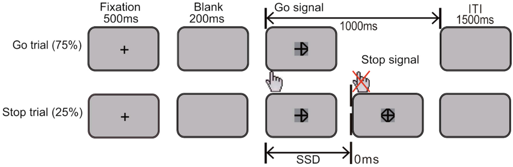 - Li, C.S.; Yan, P.; Sinha, R.; Lee, T.W. Subcortical processes of motor response inhibition during a stop signal task. Neuroimage 2008, 41, 1352–1363. [Google Scholar] [PubMed]