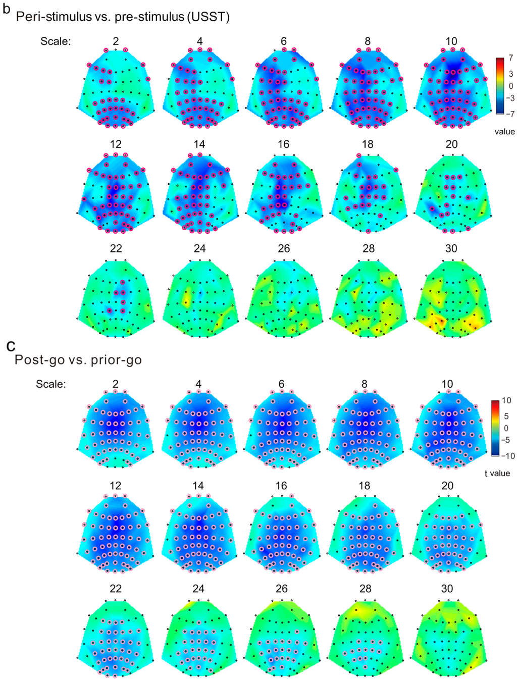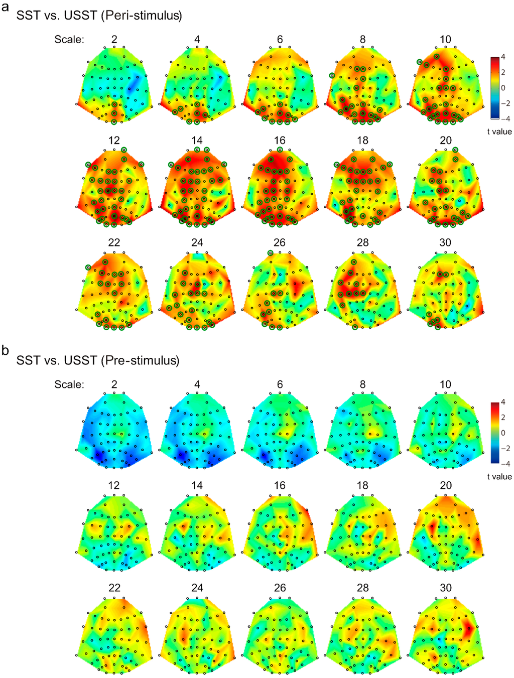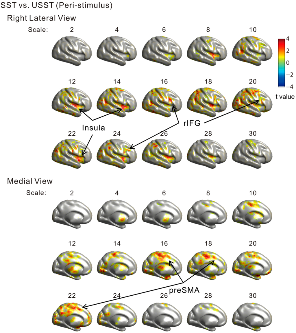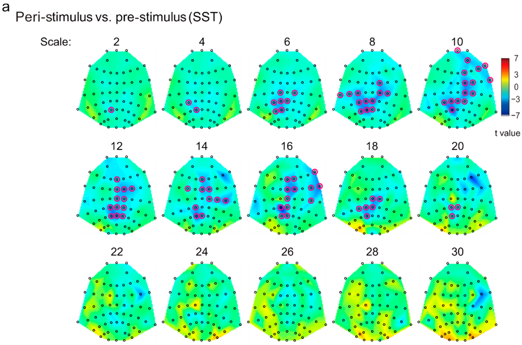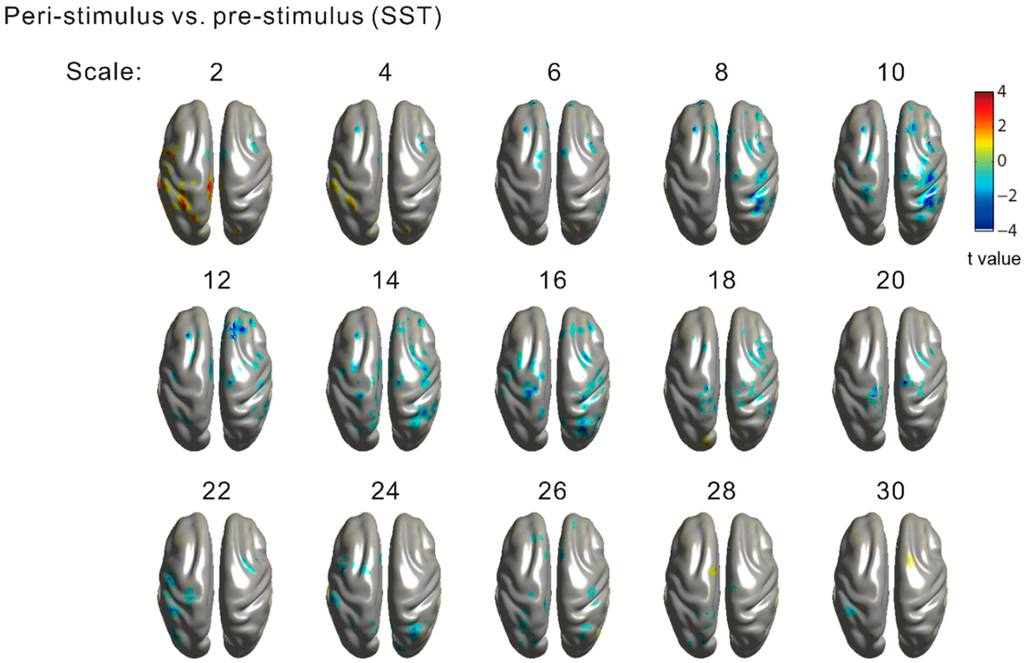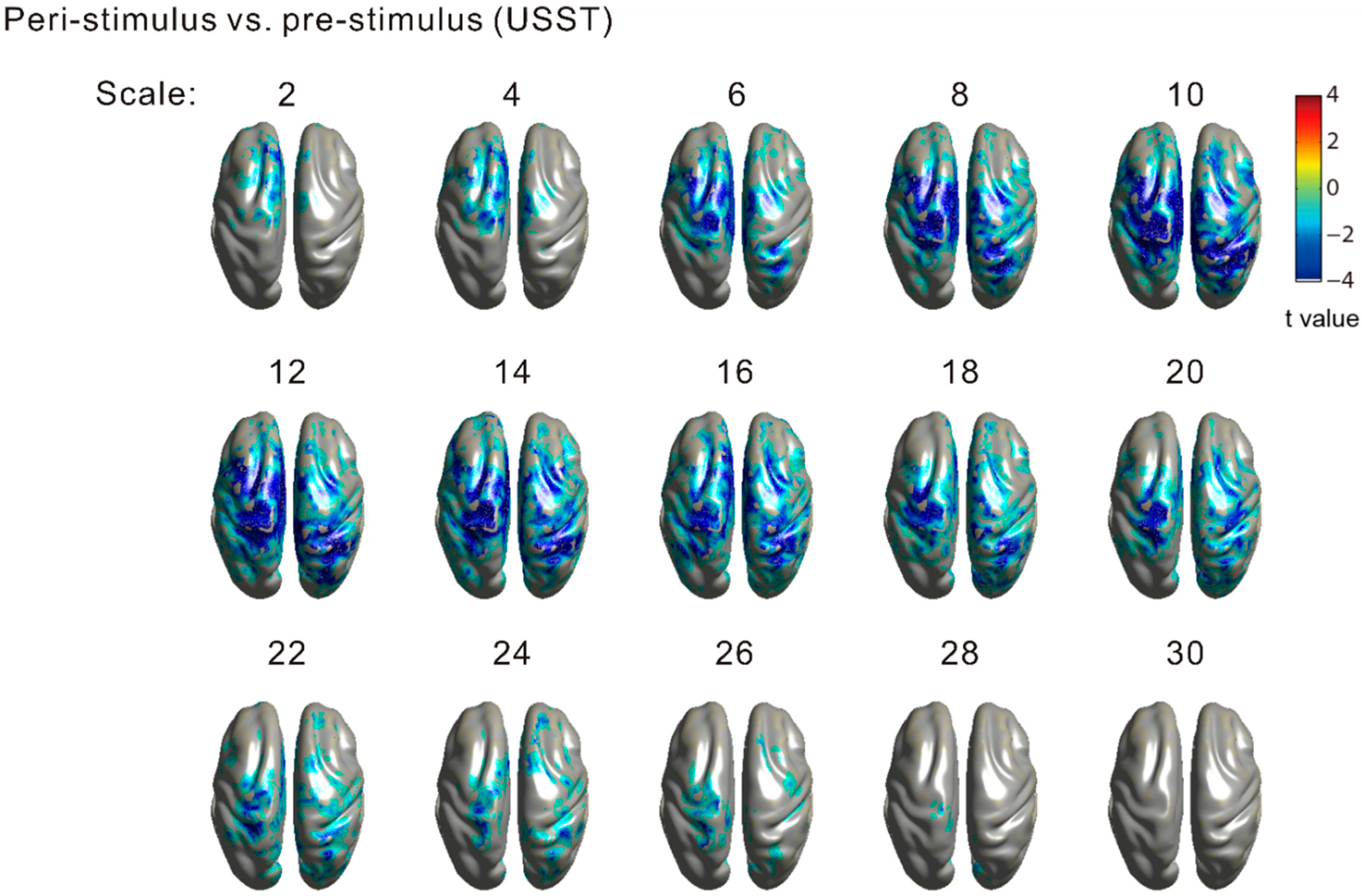 3.2. Sensor-Level MSE Contrasts (SST vs. USST; Pre-Stimulus vs. Peri-Stimulus)