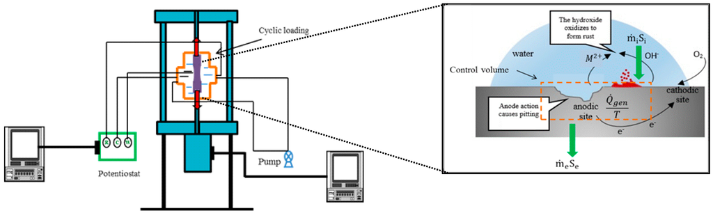 Corrosion fatigue is a synergetic damage mechanism where two of the relatively independent processes of corrosion and fatigue interact and accelerate the rate of damage otherwise realized by the sum of the two mechanisms. Figure 2 schematically shows the processes involved in a component subjected to the corrosion fatigue degradation mechanism, being electrochemically monitored. The corrosion process occurs at the surface of the specimen under a cyclic load with the following oxidation and reduction reactions for a metallic electrode, :