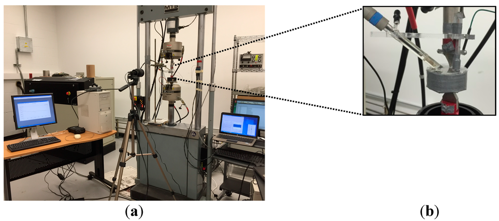 Fatigue tests were carried out in a corrosive 3.5 wt % NaCl aqueous solution, acidified with a 1 molar solution of HCl, with a pH of 3, under axial load/unload controlled under free corrosion potential. Before testing, the specimens were ground with SiC abrasive papers of grits up to #1200, then successively cleaned and rinsed with de-ionized water and acetone. The schematic of the experimental setup is shown in Figure 4a. The Instron software recorded mechanical stress and strain values. A digital image correlation technique [80] was also employed to validate Instron outputs. An electrochemical corrosion cell, made from plexiglass, was designed and built to be compatible with the whole gauge section of the specimen as shown in Figure 4b. The whole gauge section (the area of interest) of the specimen was electrochemically monitored using a Gamry potentiostat device with an Ag/AgCl electrode as the reference electrode (RE) maintained at a constant distance (2 mm) from the specimen, a platinum counter electrode (CE) and the specimen as the working electrode (WE). All the tests were conducted after the WE, immersed in the solution, reached the equilibrium OCP.